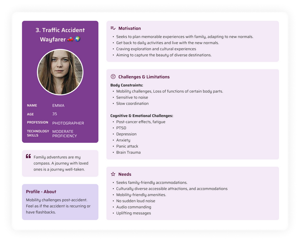We focused on specific disabilities to gain a comprehensive understanding of different needs. We explored Autism, Dyslexia, Acquired Brain Injury, Mobility Loss, Elderly but we then realized that travel barriers weren't just about disabilities, they extended to a much broader audience. So we then researched on other possible stakeholders including, pregnant travelers, budget-conscious individuals, cultural diversity considerations, people recovering from injuries or illnesses.
